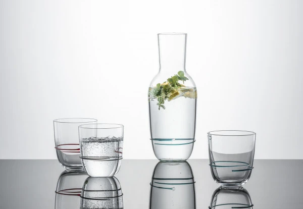 Nicht nur die zeitlose Form, auch das hochwertige Glas besticht durch einen ausdauernden Charakter. Für einen langanhaltenden Glanz wird die Reinigung per Hand empfohlen. Der Glasbecher überzeugt mit rund 0,5 l Inhalt qualitativ genauso, wie die dazugehörige Karaffe mit grünem Farbwirbel. Ob einfarbig oder gemischt mit Farbakzenten in Aubergine, Rot, Schwarz, Blau und Smaragdgrün – die Serie Aura passt zu vielfältigen Anlässen und zu den verschiedensten Dekorationen.