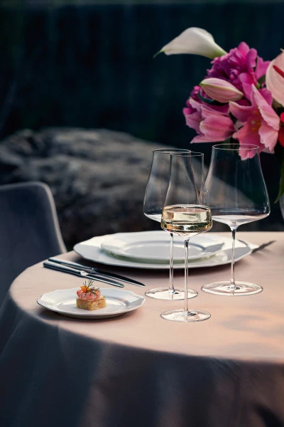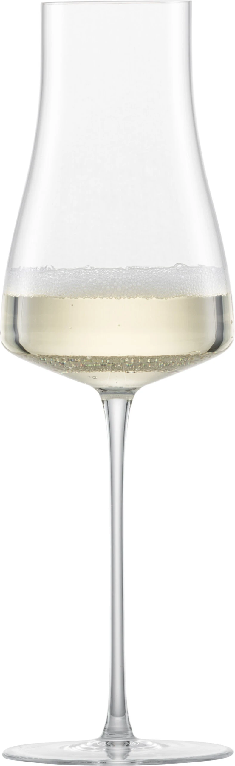 Das mundgeblasene Blanc-de-Blancs Champagnerglas der Serie The Moment von ZWIESEL GLAS ist für einen fruchtbetonten und frischen Champagner konzipiert worden. Der grazile Stiel endet in einem hohen und lang gestreckten Kelch. Der relativ schmale Glaskörper fließt von einem mittleren Bodenspiegel konkav nach oben und verjüngt sich bis zum Mundrand.