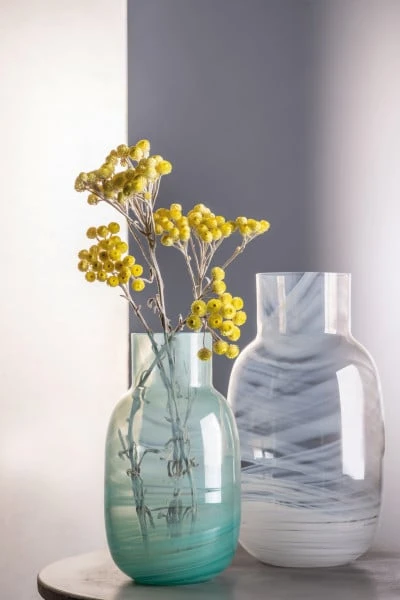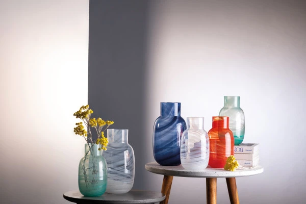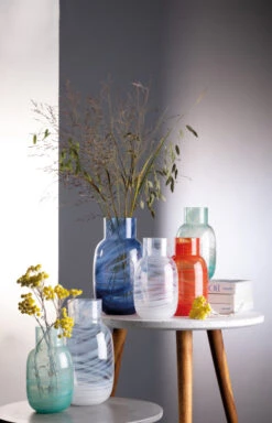 Besonders in Kombination mit den anderen Farben der handgefertigten Vasenserie Waters entsteht ein einzigartiges Spiel aus Licht und Glas. Jedes Produkt der Serie ist ein Unikat. Besonders wird die große Vase Snow durch die kleine Vase Blue im Interior-Design ergänzt.