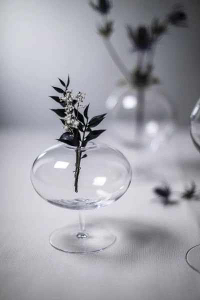 Feminin schweben die Vasen Fleur und bilden ein harmonisches Ensemble. Besonders gut zur Geltung kommt die 12cm hohe Vase im Zusammenspiel mit den zwei weiteren Größen der handgefertigten Serie Fleur. Das Trio erweckt den Anschein, als würden Seifenblasen durch den Raum schweben.